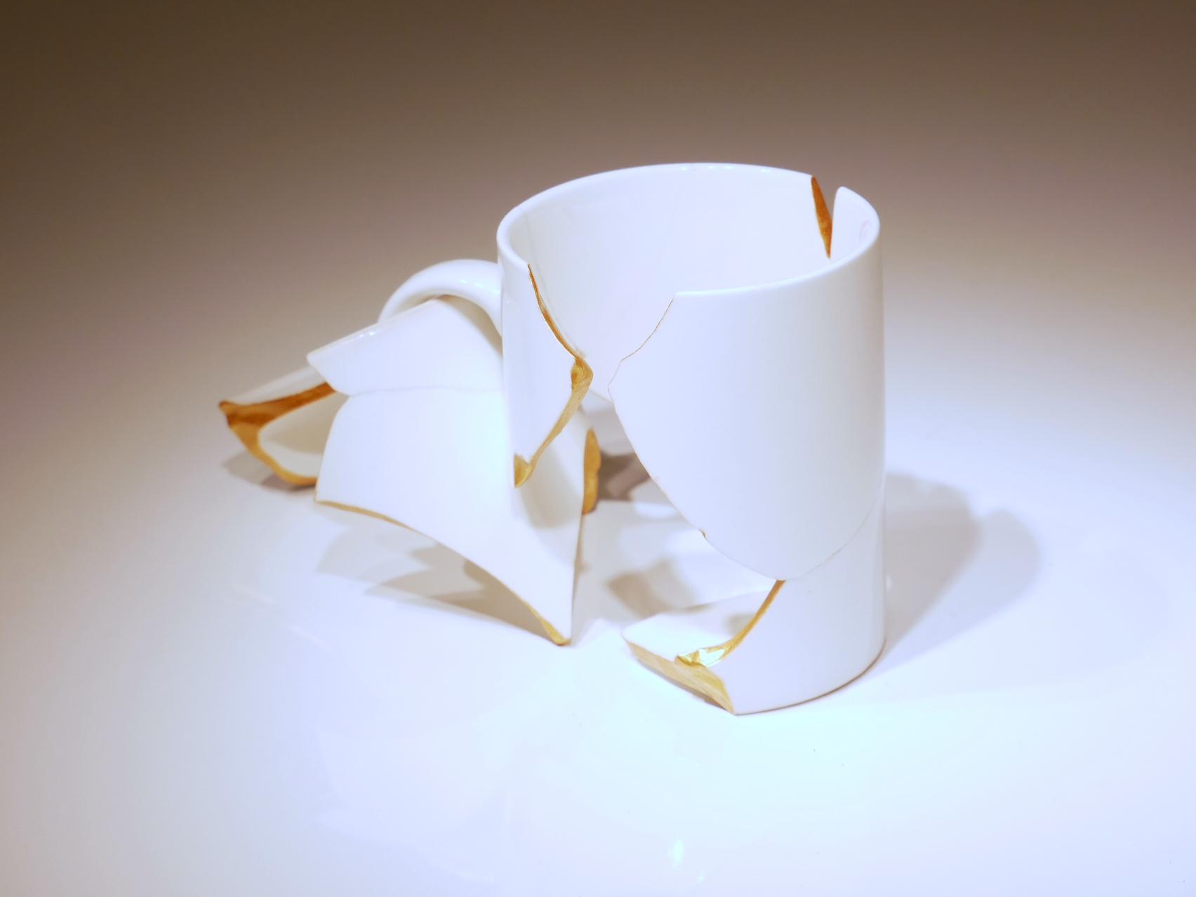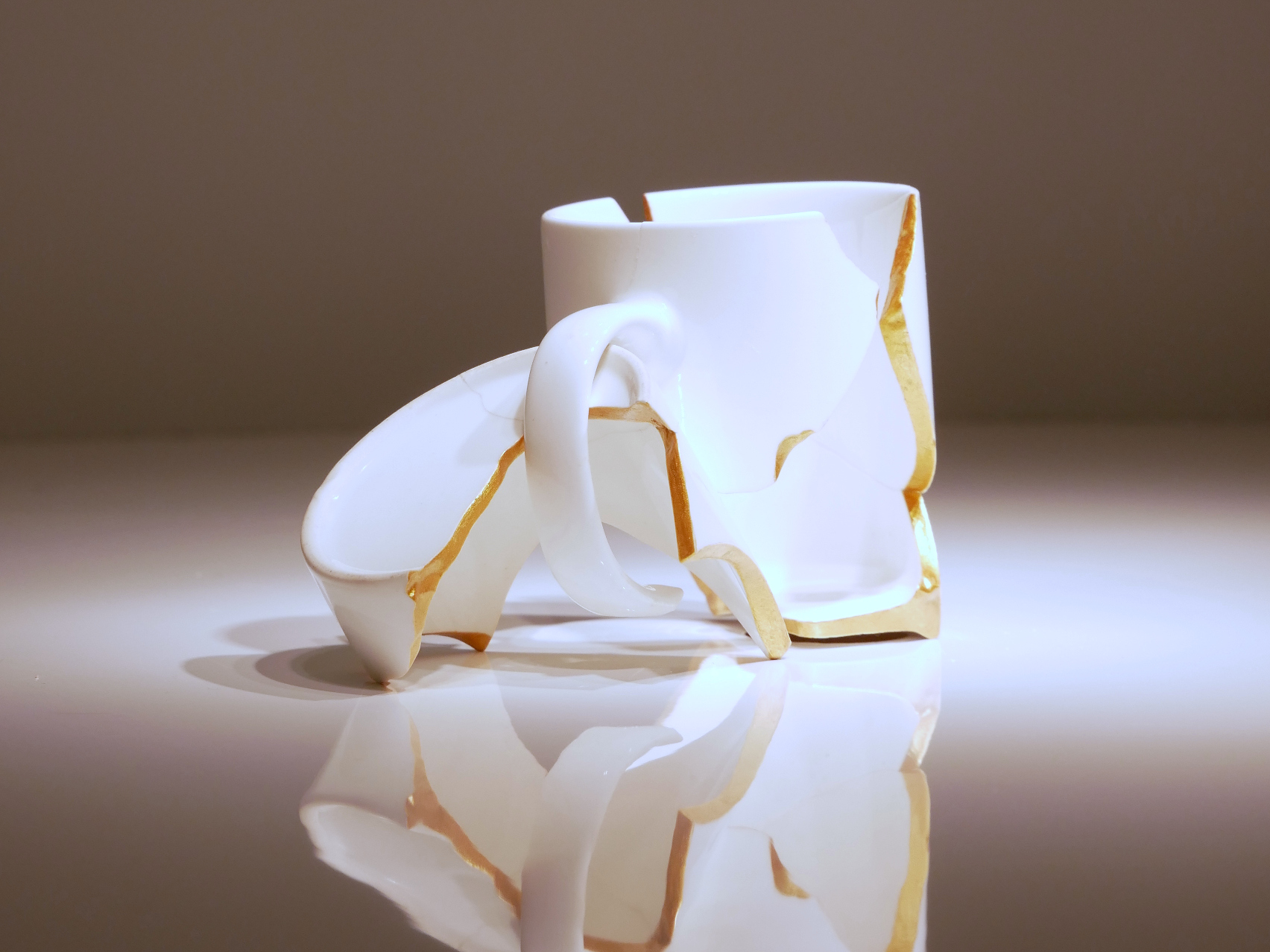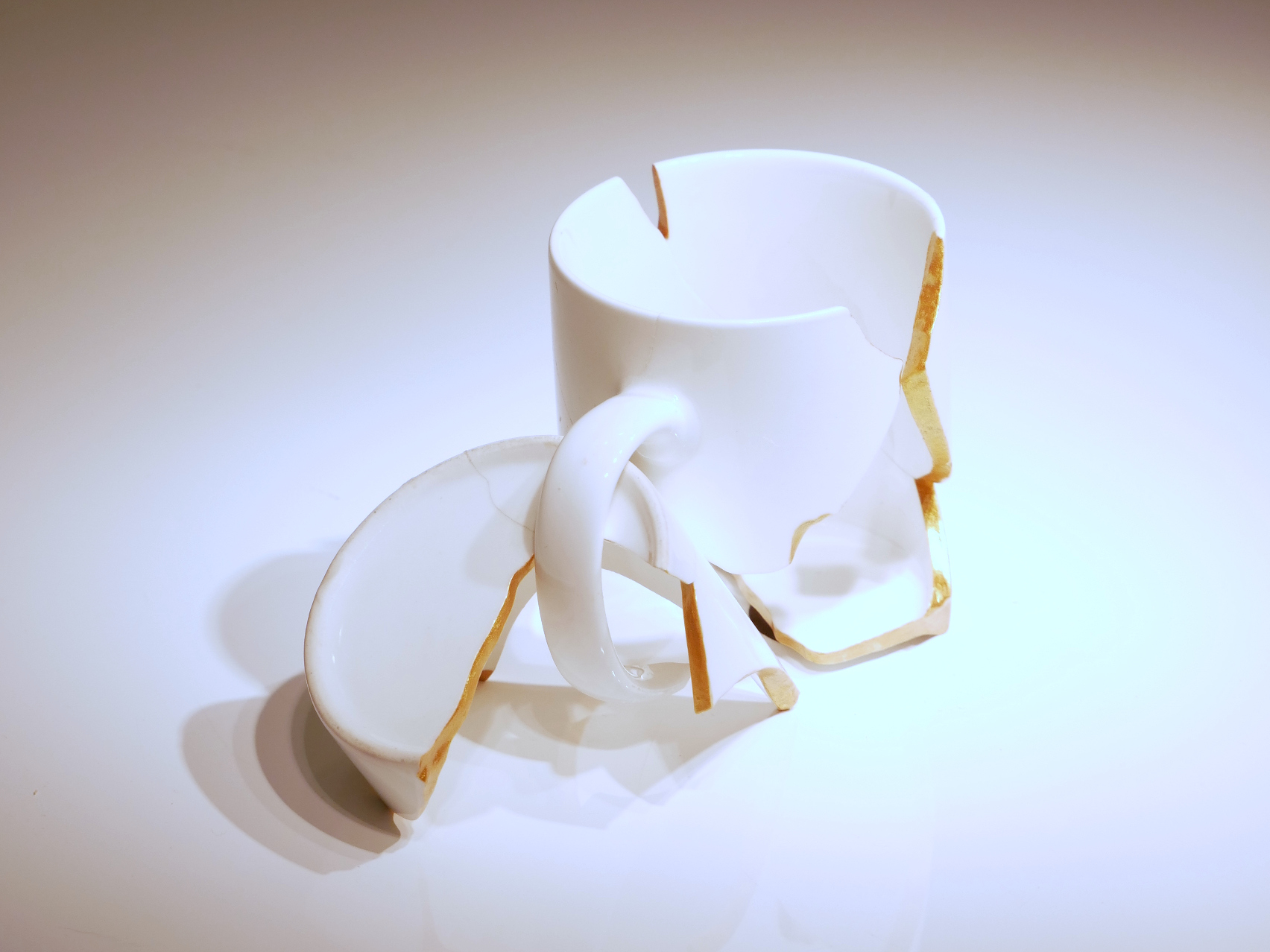Reseña: Esta taza rota busca un modo de encuentro entre sus partes. Un equilibrio precario pero potente, la sostiene y vuelve a soportar, aludiendo a una nueva manera de estar tras una fractura.