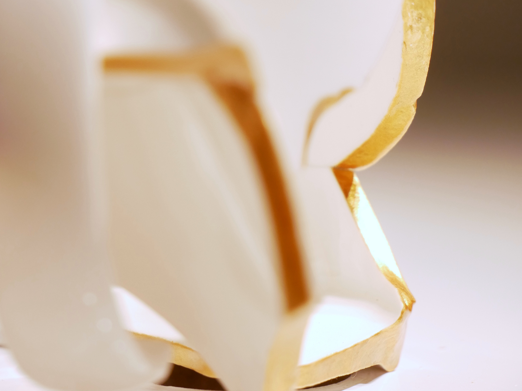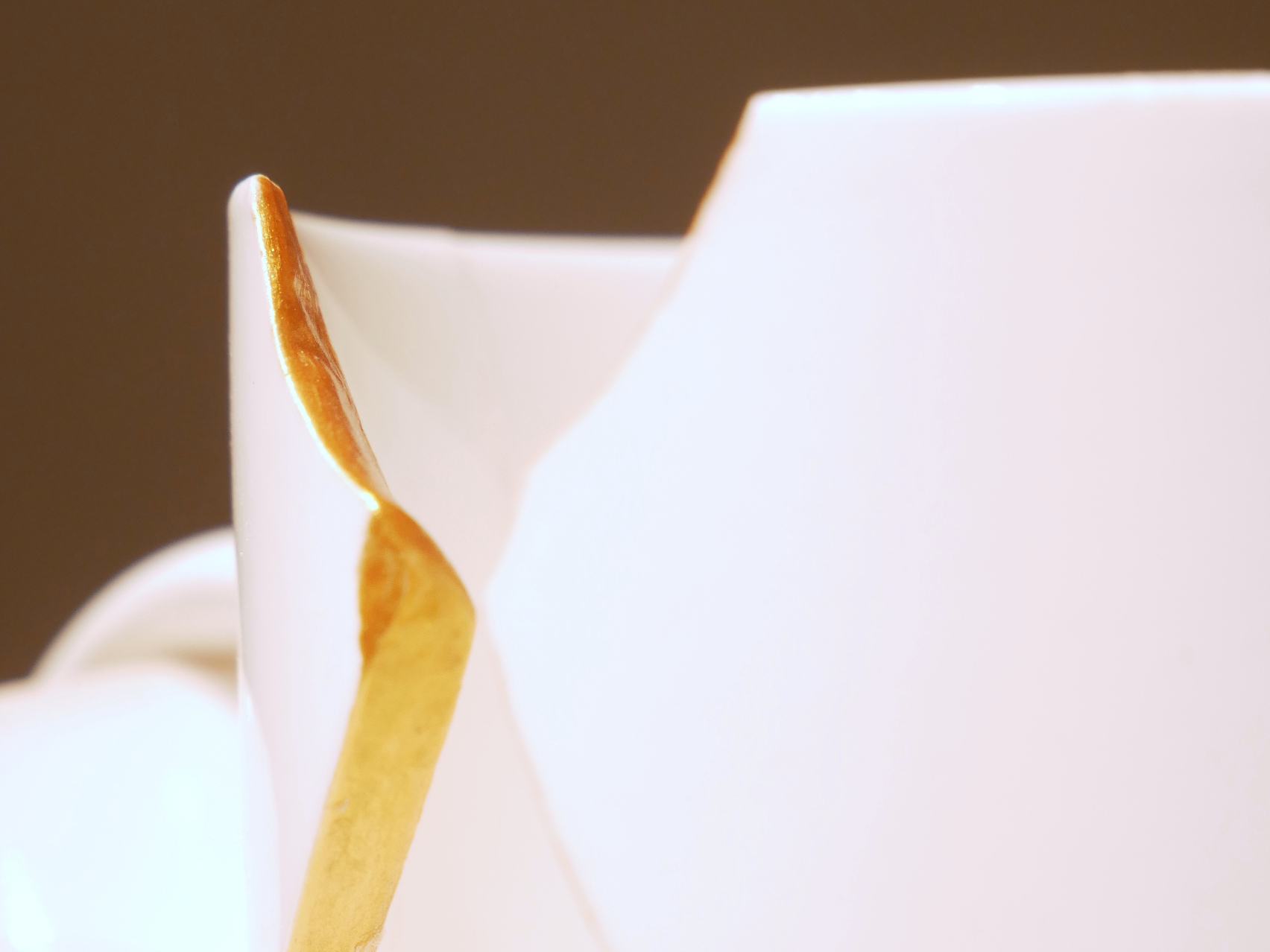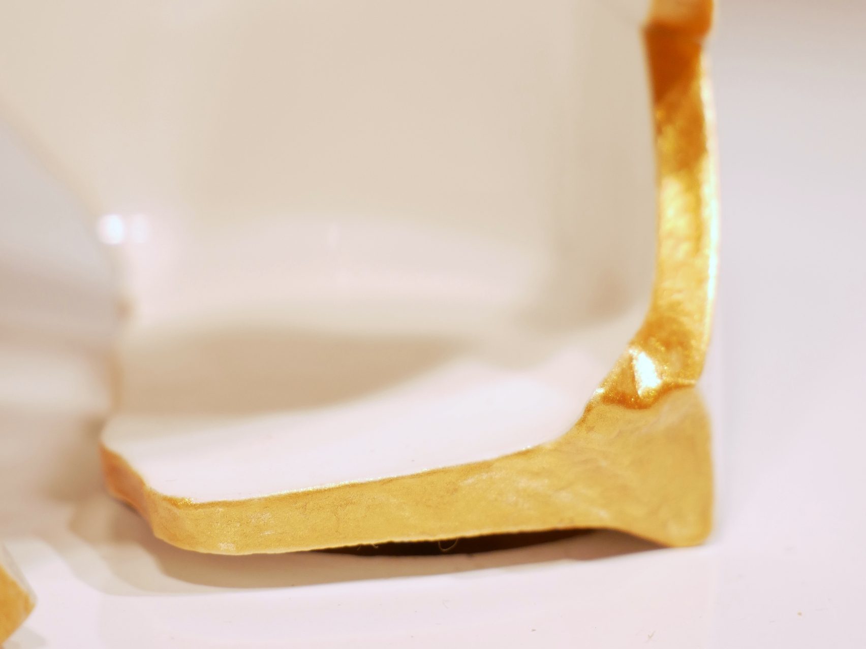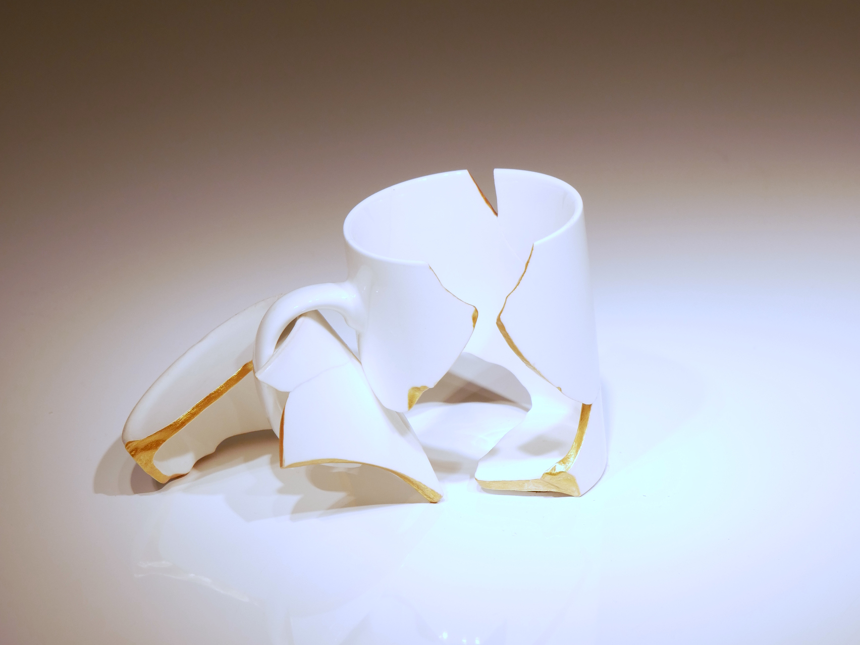 Reseña: Esta taza rota busca un modo de encuentro entre sus partes. Un equilibrio precario pero potente, la sostiene y vuelve a soportar, aludiendo a una nueva manera de estar tras una fractura.